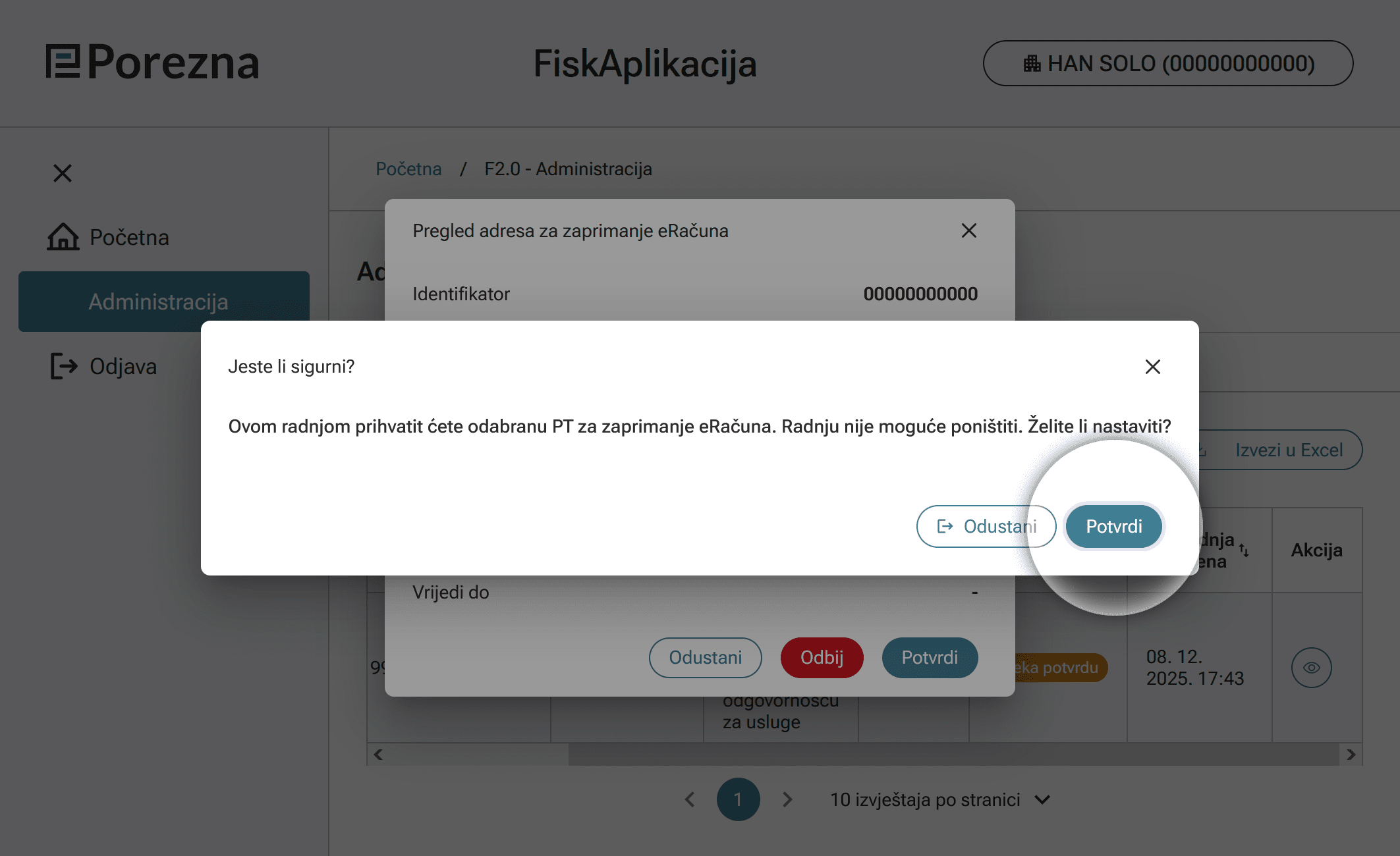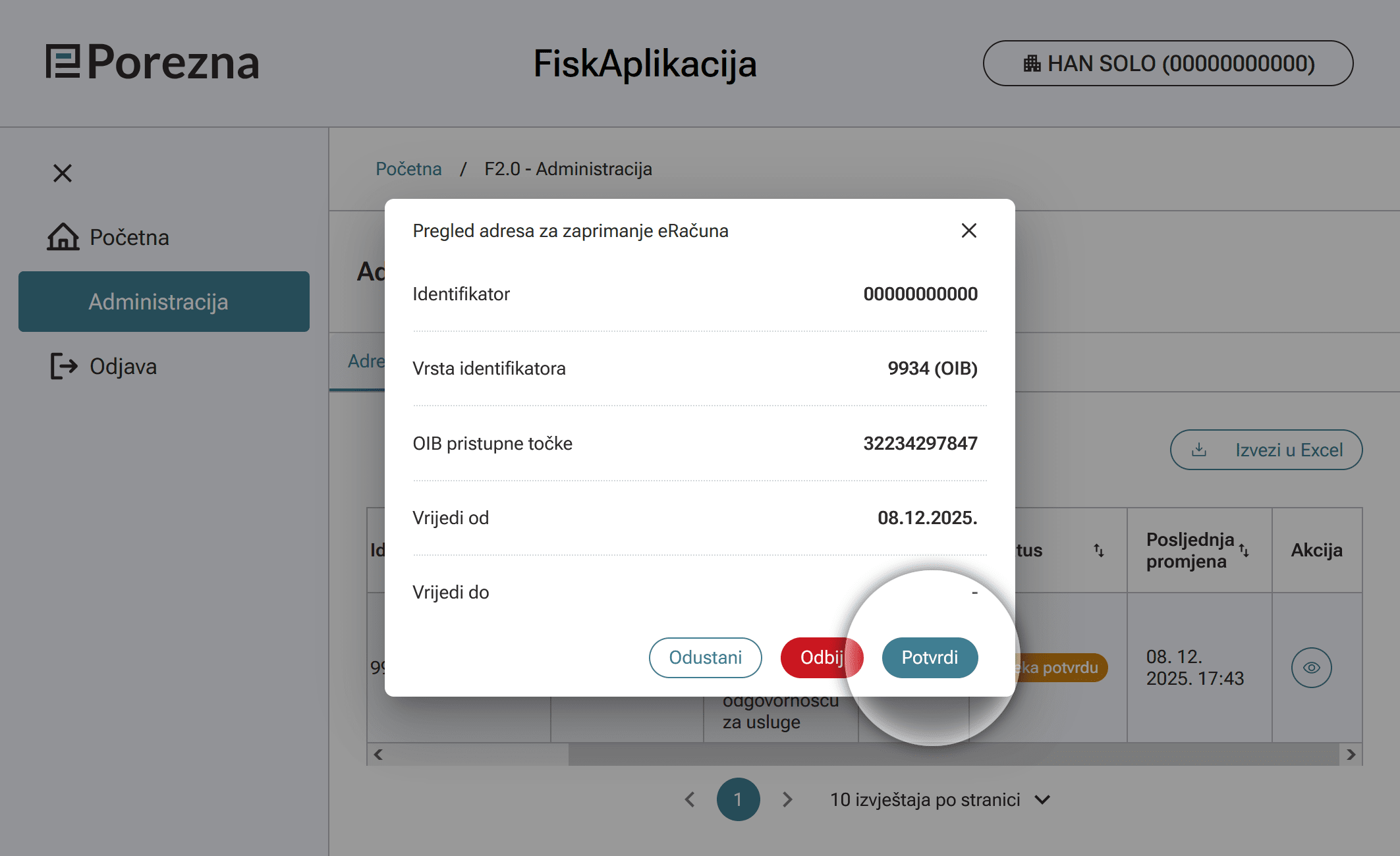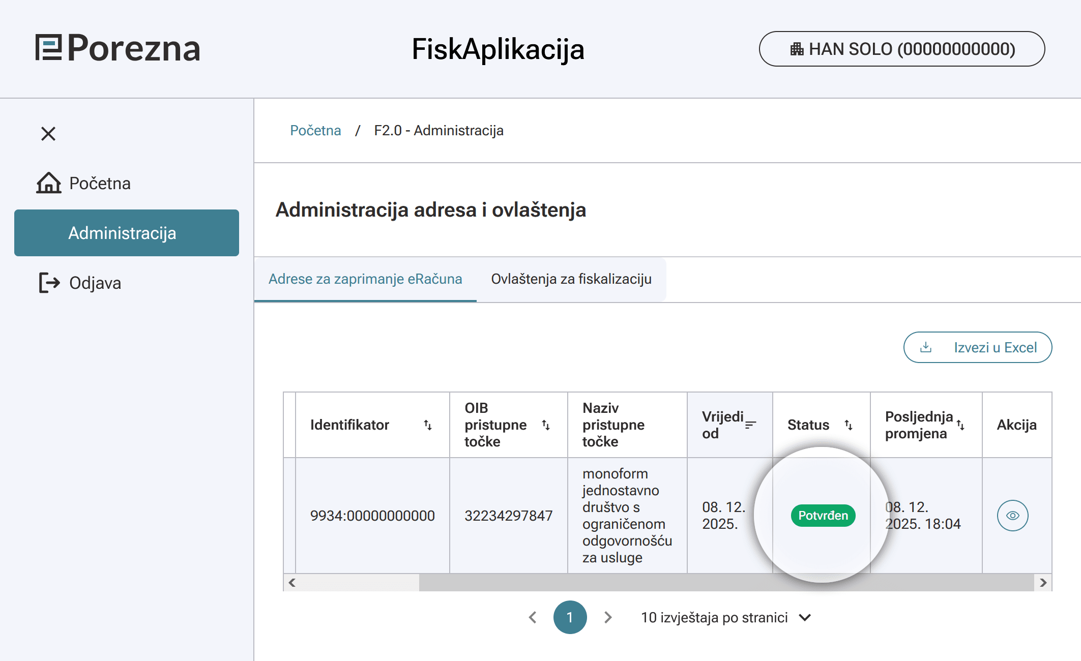 U FiskAplikaciji, pod "Administracija" > "Adrese za zaprimanje eRačuna" će ti se pojaviti "monoform..." sa statusom "Čeka potvrdu".